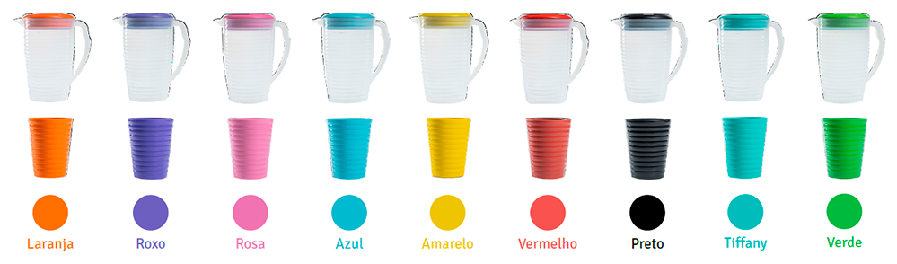 O kit 06 é composto por 1 jarra Premium 2 litros + 4 copos ondulados 350ml.